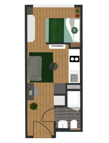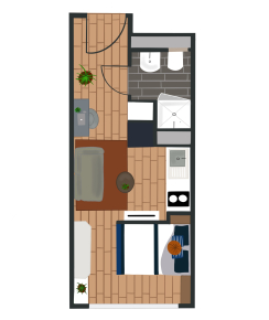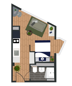 Available in two different colour palettes, our comfy studio apartments are smart-home enabled, have kitchens with integrated appliances and ottoman beds with storage underneath. Rental prices differ depending on location in the building.