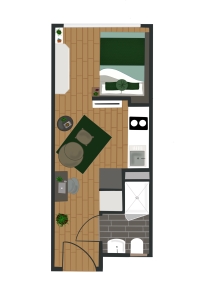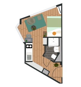 Available in two different colour palettes, our cosy studio apartments are smart-home enabled, have kitchens with integrated appliances and ottoman beds with storage underneath. Rental prices differ depending on location in the building.