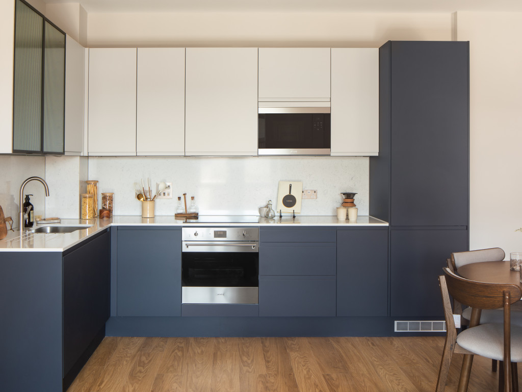 A combination of rich midnight blue and soft grey cabinets creates a sleek, modern contrast- ideal for those seeking a sophisticated aesthetic.