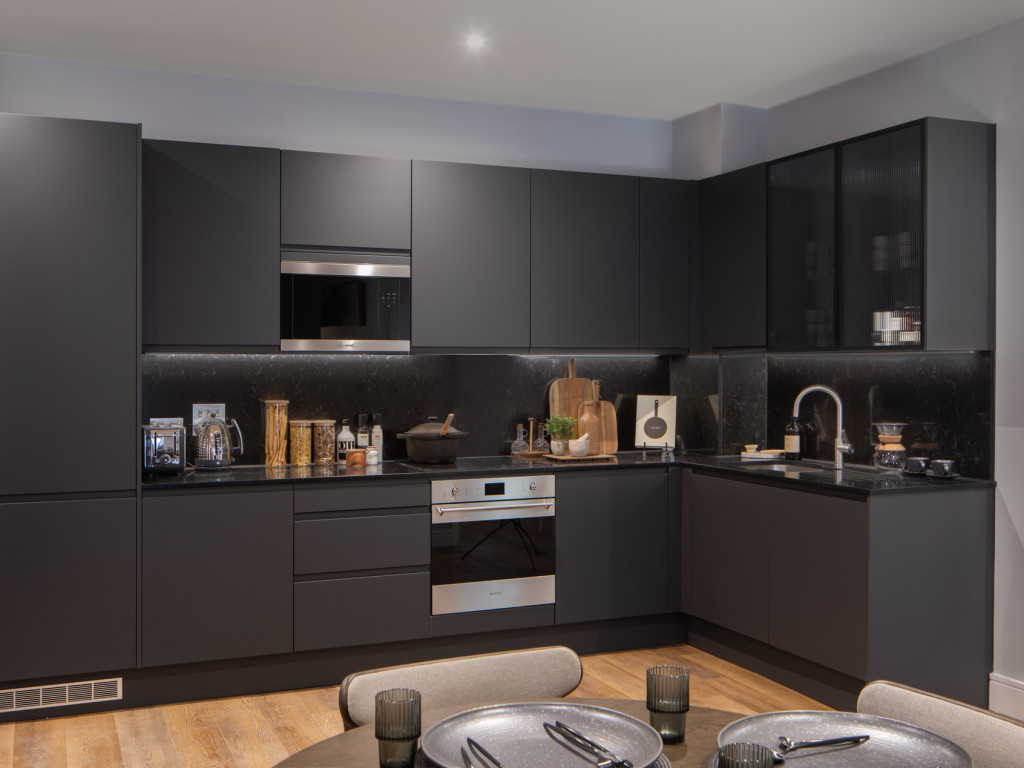 Graphite cabinets paired with black worktops create a bold, contemporary look with a mid-century influence.