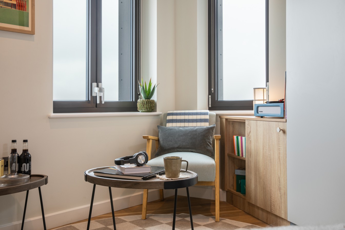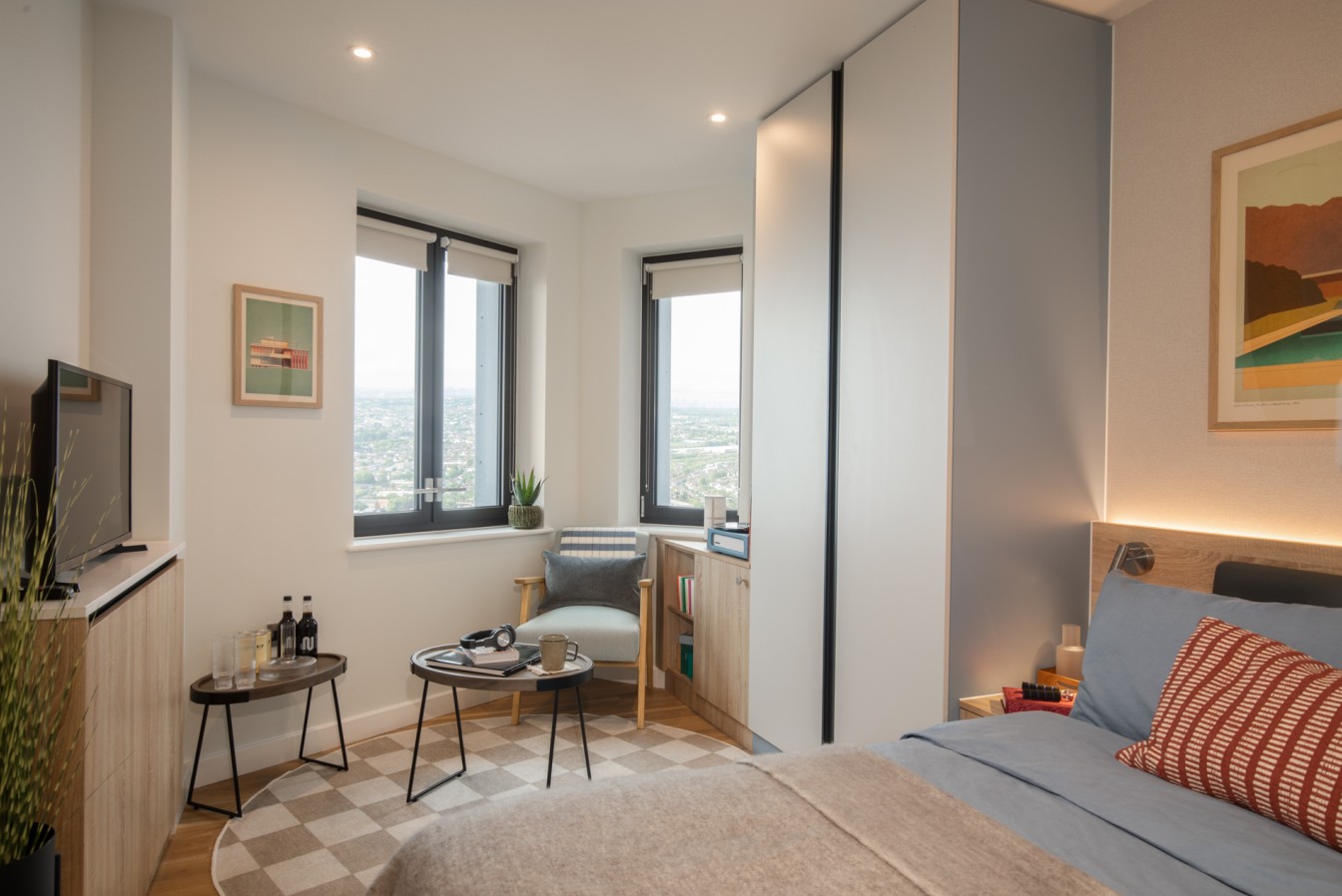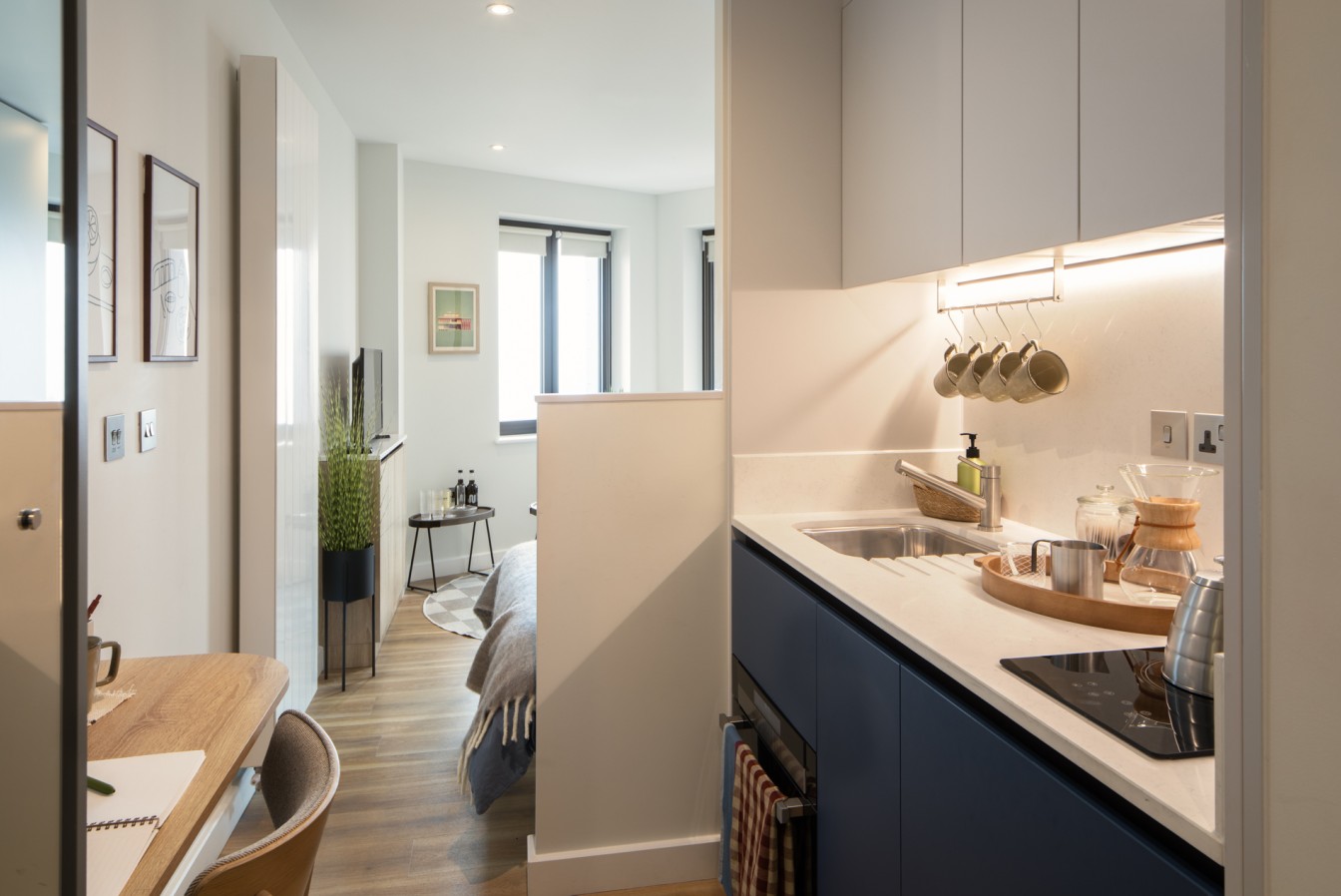 Available in three different colour palettes, our all-inclusive cosy studio apartments have 1GB WiFi throughout, kitchens with integrated appliances (oven & microwave) and ottoman beds that lift to provide storage underneath. Rental prices differ dependent on location in the building.