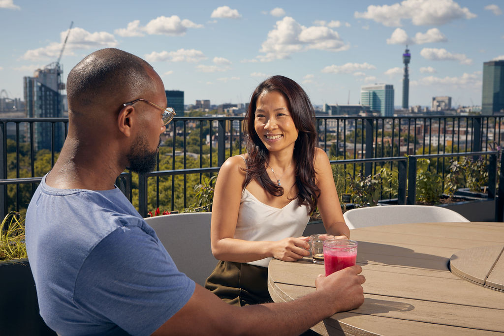 Head to the penthouse terrace on the top floor for stunning city views. Overlooking St Pancras Station and beyond, this impressive space is complete with comfortable sofas, tables and sun loungers. It’s a standout space for sunbathing during the day or enjoying a glass of wine in the evening from the convenient wine dispenser.