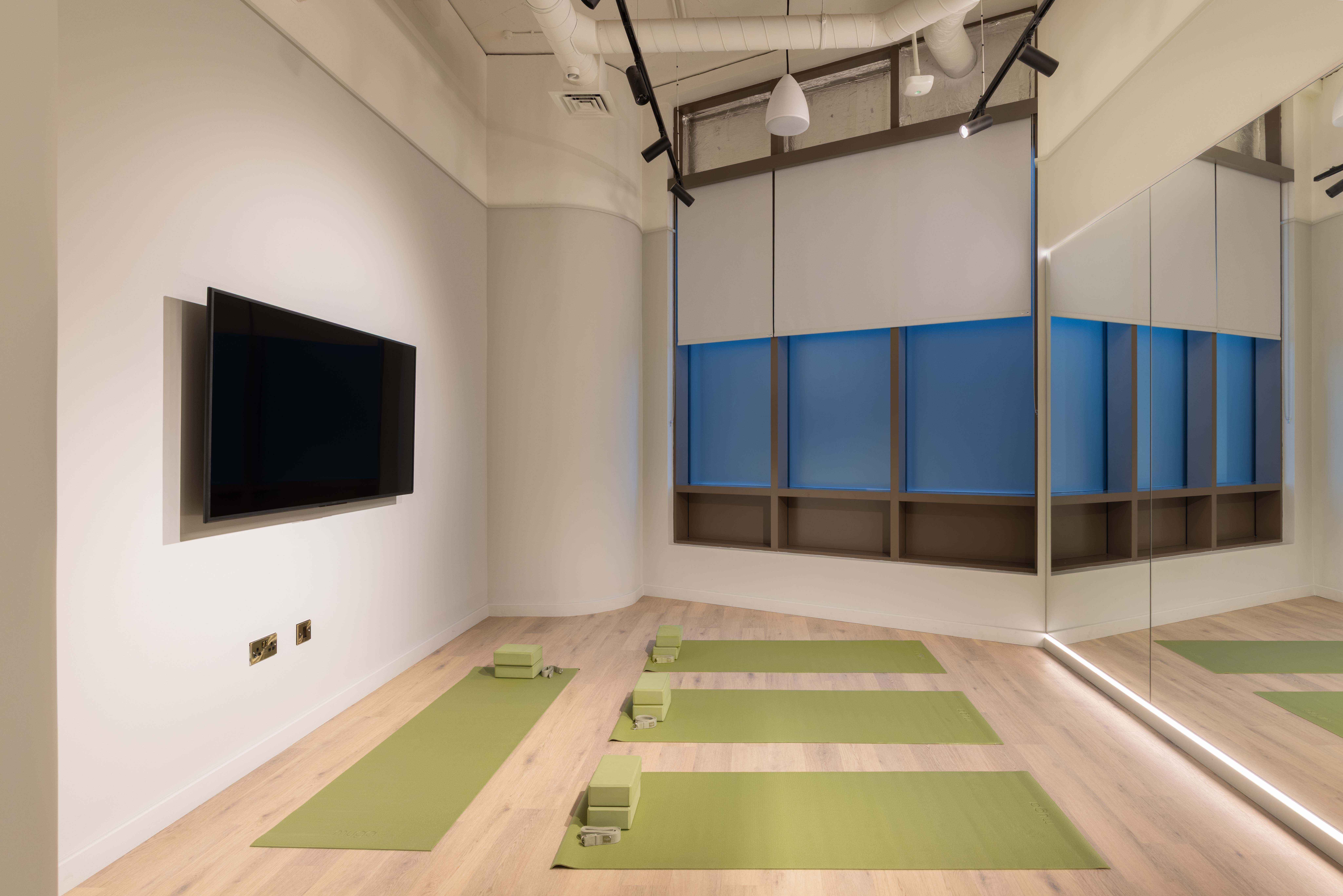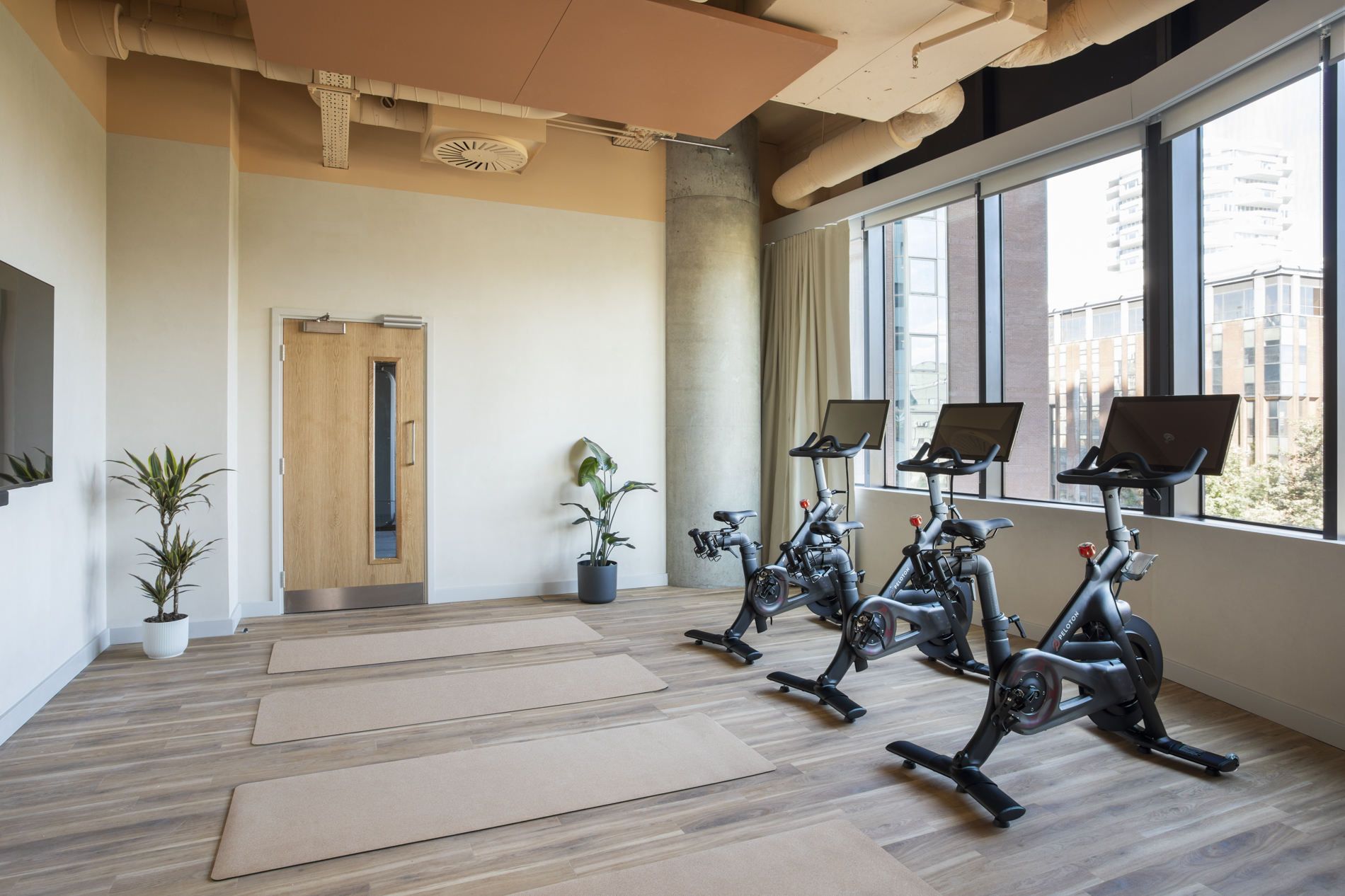 The studio is fully equipped with yoga mats and accessories, Peloton bikes and a large TV, making it easy to follow guided classes or create your own flow. It’s a calm, light-filled space that encourages mindful movement.