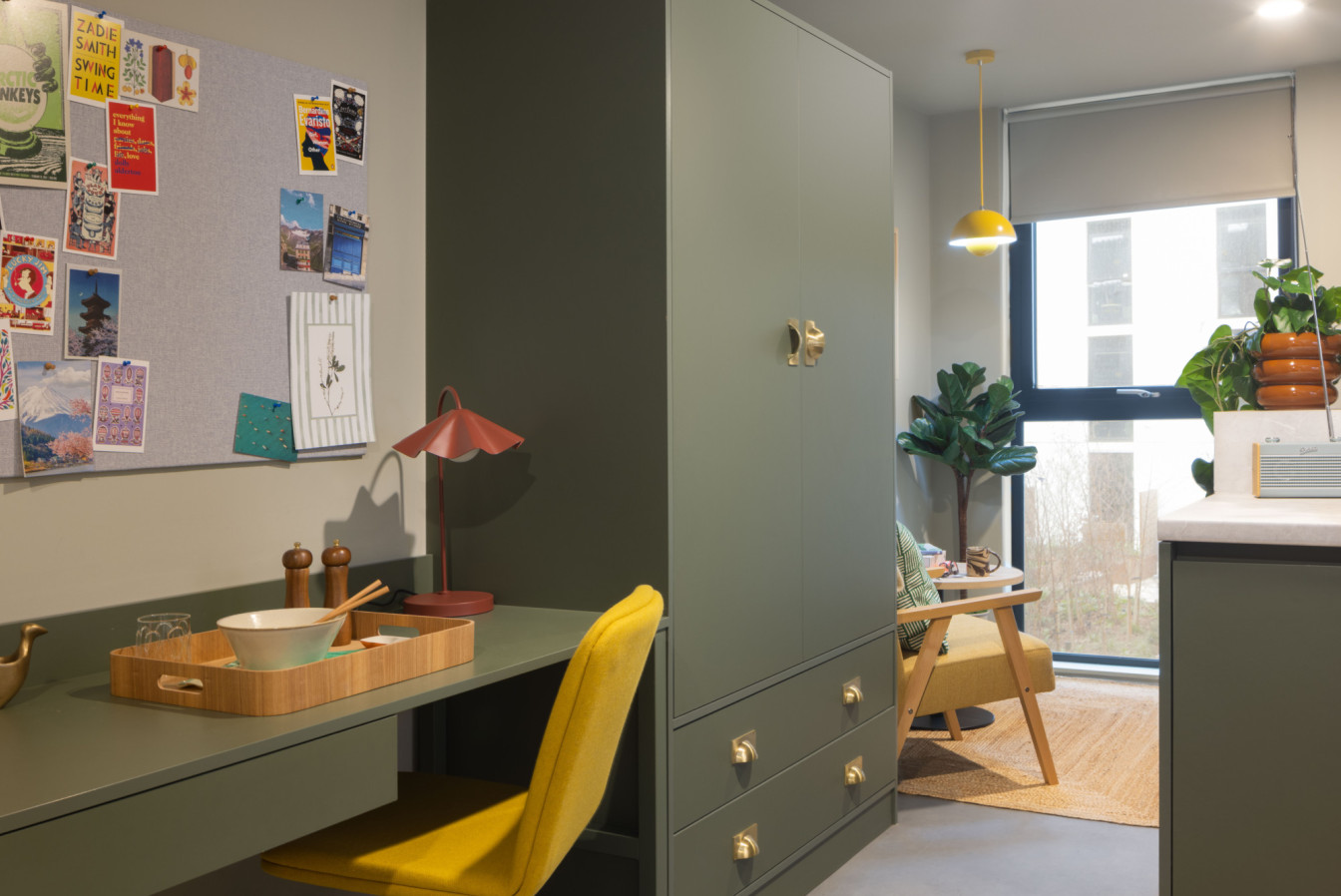 Our Comfy Studios in Leeds are built for comfort and focus. Each has a study area with oversized desk, drawers, pinboard, and ergonomic chair, plus a double bed and a comfy armchair or sofa. You’ll find plenty of storage, a full-height window, and a pegboard to personalise your space — plus a private kitchen and en suite for total independence.