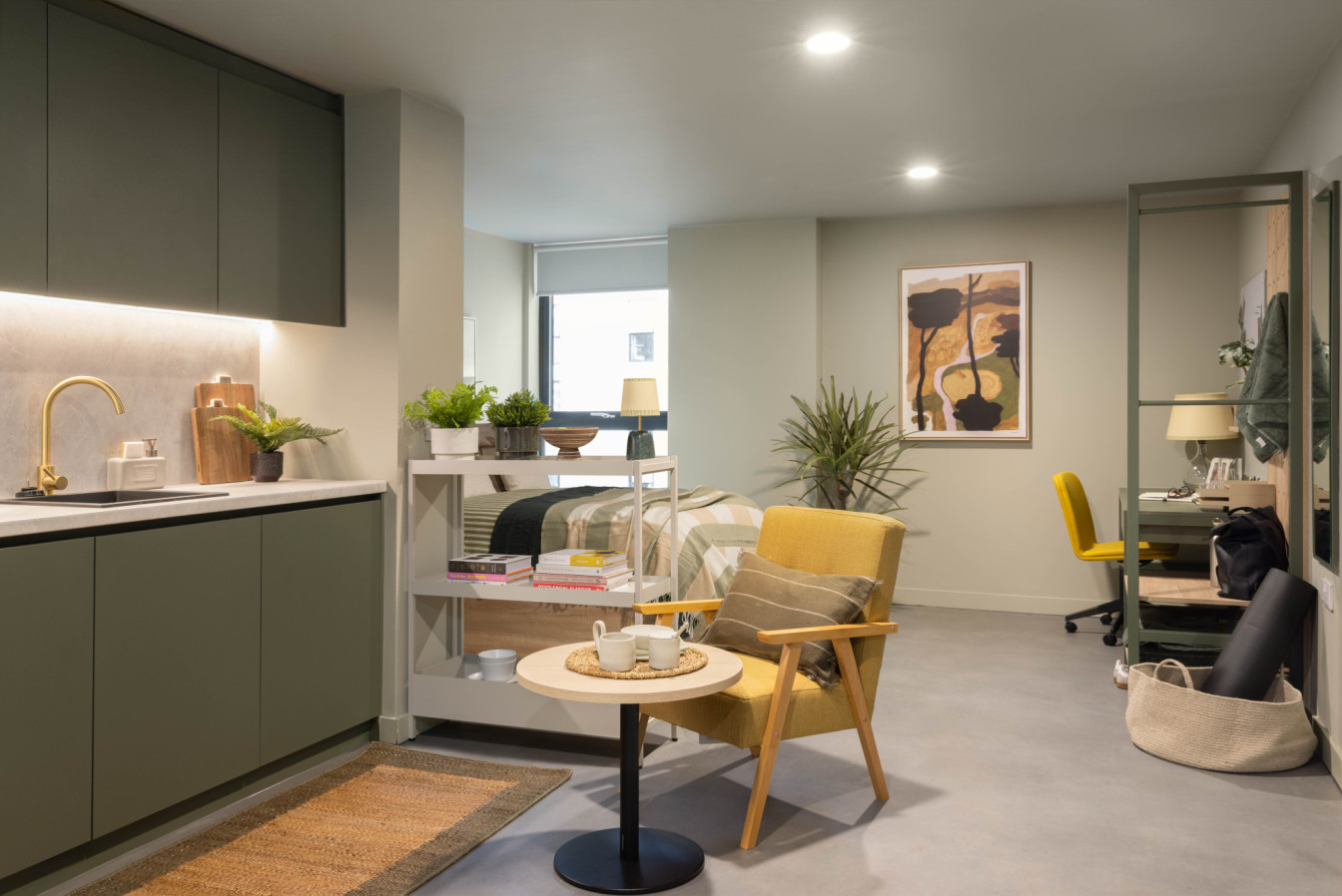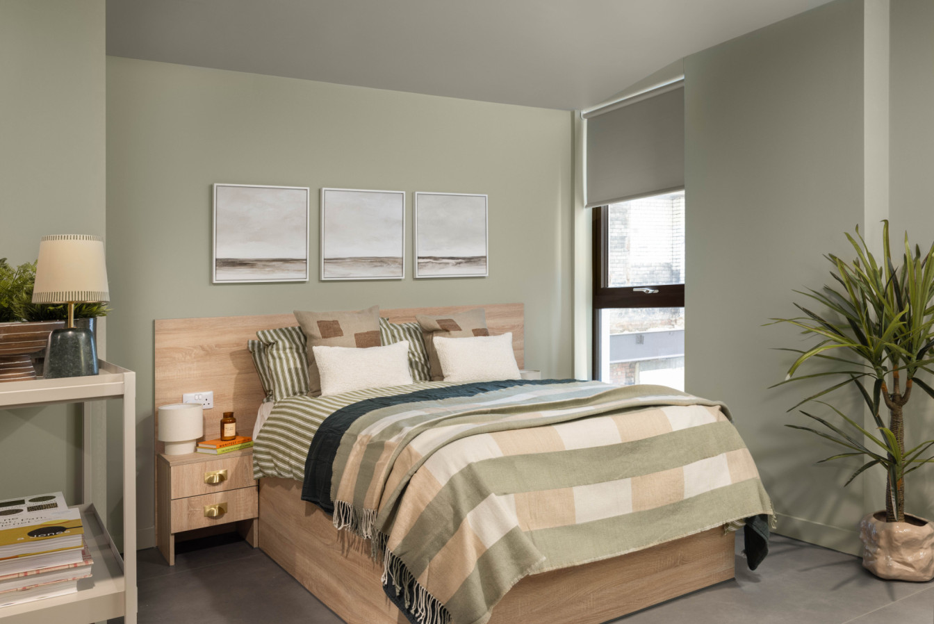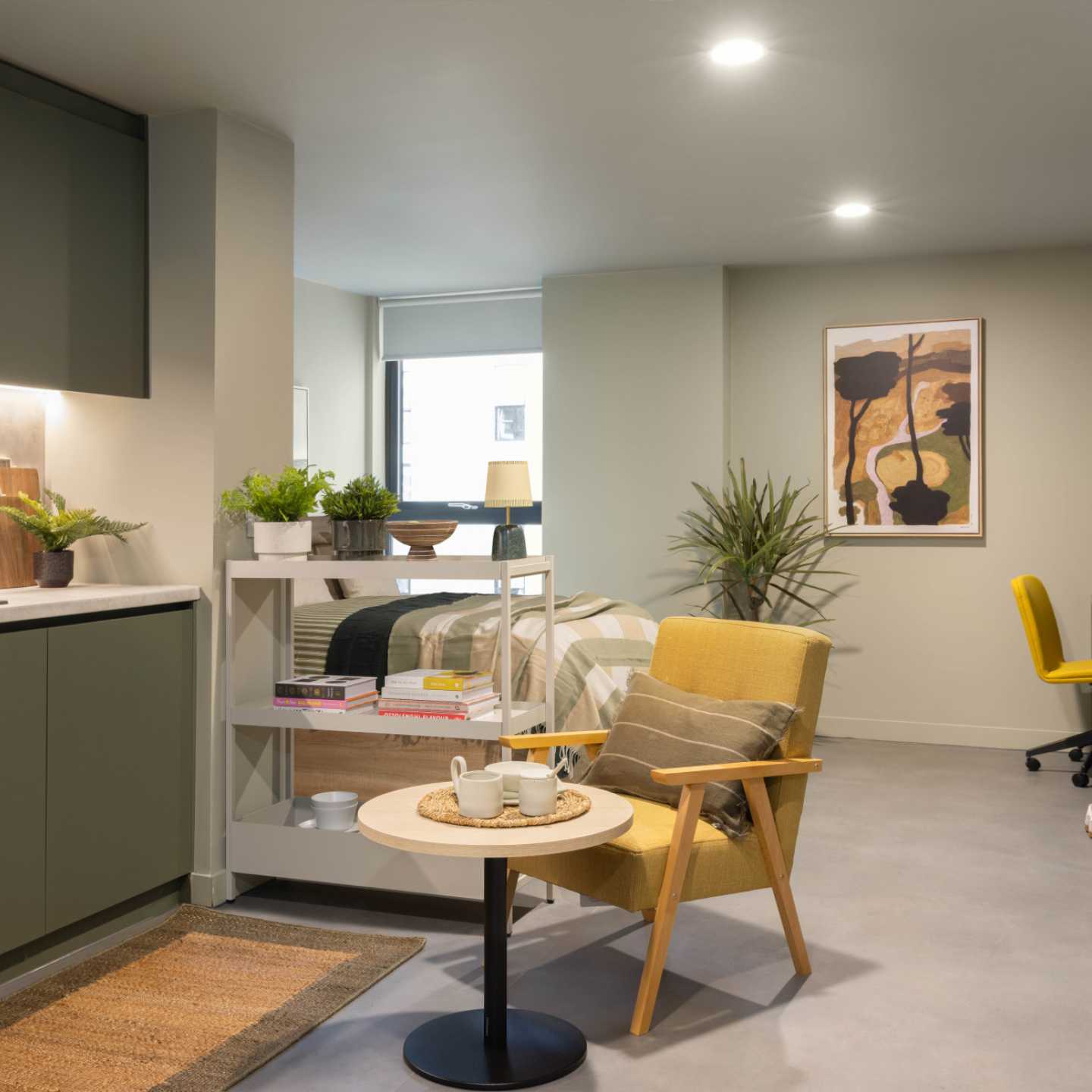 Our Roomy Studios in Leeds are built for comfort and focus. Each has a study area with oversized desk, drawers, pinboard, and ergonomic chair, plus a double bed and a comfy armchair or sofa. You’ll find plenty of storage, a full-height window, and a pegboard to personalise your space — plus a private kitchen and en suite for total independence.